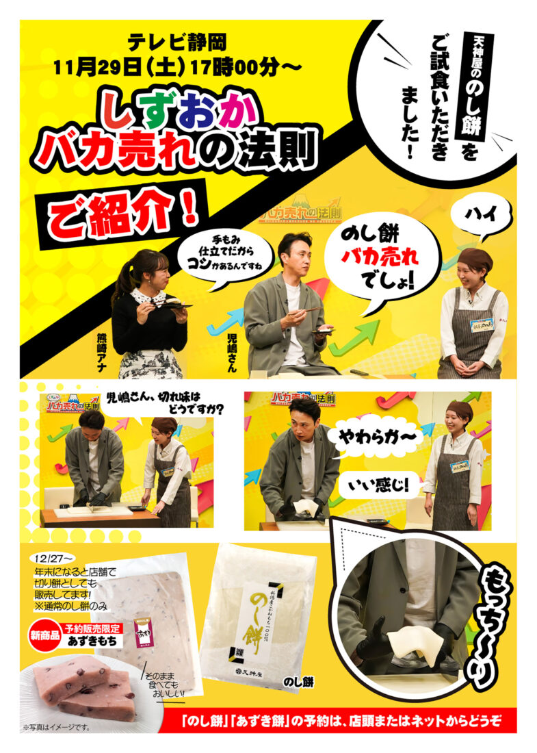 この度、2025年11月29日(土)17:00~テレビ静岡(フジテレビ系列)『しずおかバカ売れの法則』に、天神屋が紹介されました!