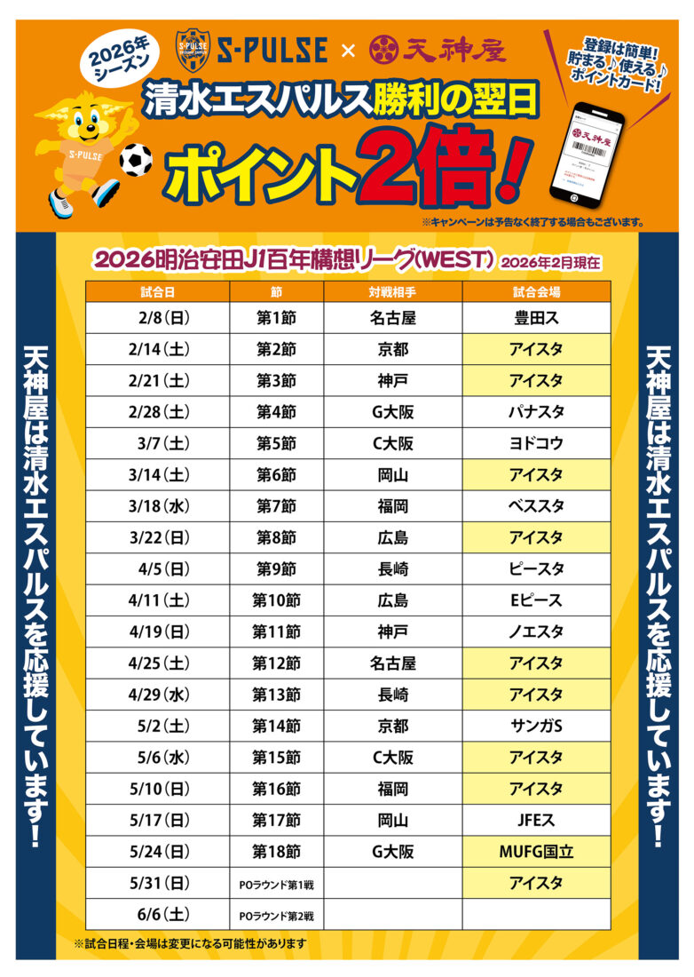 ①2026年シーズン「清水エスパルス勝利の翌日・天神屋ポイント2倍」